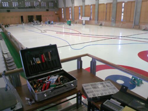 スポーツ会館のスタッフにお願いして、 カーリングホールの様子を見せていただきました。 9月1日、2日で敷き詰めていたスポーツマットを片付け、 現在は、倉庫からカーリング用品を運び出している最中だそうです。 いよいよ、 カーリングシーズンが近づいて…