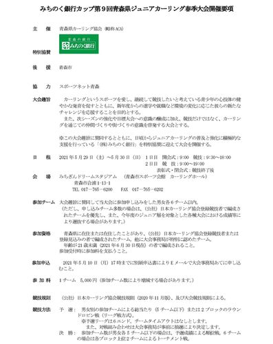 みちのく銀行CUP 第9回青森県ジュニアカーリング春季大会のお知らせです。 新型コロナウイルス感染症の拡大状況によっては、 大会が中止又は延期されることがありますので予めご了承ください。 開催要項及び参加申込書は、青森県カーリング協会もHPに掲載し…