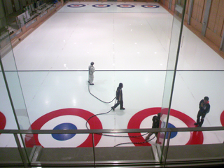 散水時間から散水量を割り出して氷の厚さを調べるのだそうです。