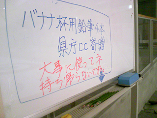 2011-03-06 バナナ杯カーリングの専用鉛筆(笑) 出来事 カーリング 青森県庁CCからバナナ杯に、 限りなくささやかな贈り物です。 ホワイトボードはかなり大げさですが(笑)。 スコアへの記入、 FAXシートへの記入、 対戦表への記入などにお使いください。 鉛筆削りもありますよ。 いや~、何て大げさなんだ! ささやかなのに!(笑) 【追加】 あまりにも大げさなので書き換えました↓