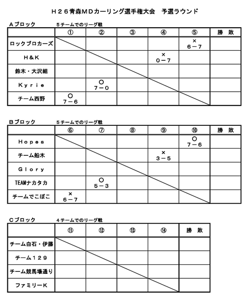 2014-11-28 「第8回青森県ミックスダブルスカーリング選手権大会」始まりました! 出来事 カーリング 第8回青森県カーリング選手権大会が始まりました。 予選ラウンドの組合せと1ラウンド終了時点の勝敗はこちら↓。 ※拡大表示できます。 予選ラウンドのスケジュールはこちら↓。 それなりに(笑)、各チームの応援をお願いします。