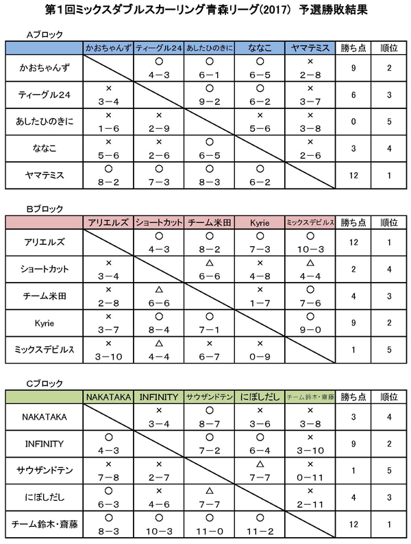 2017-08-29 第1回MDカーリング青森リーグの結果発表~! 出来事 カーリング 第1回ミックスダブルスカーリング青森リーグの結果です。 まずは予選ラウンドの結果。 そしてプレーオフの結果です。 入賞チームのみなさん、おめでとうございます。 やはり練習しているチームは強い!! 青森で行われる日本MD選手権も楽しみですね。 なお、この大会の表彰式は、 31日のバナナ杯開会式後に行う予定ですよ~。