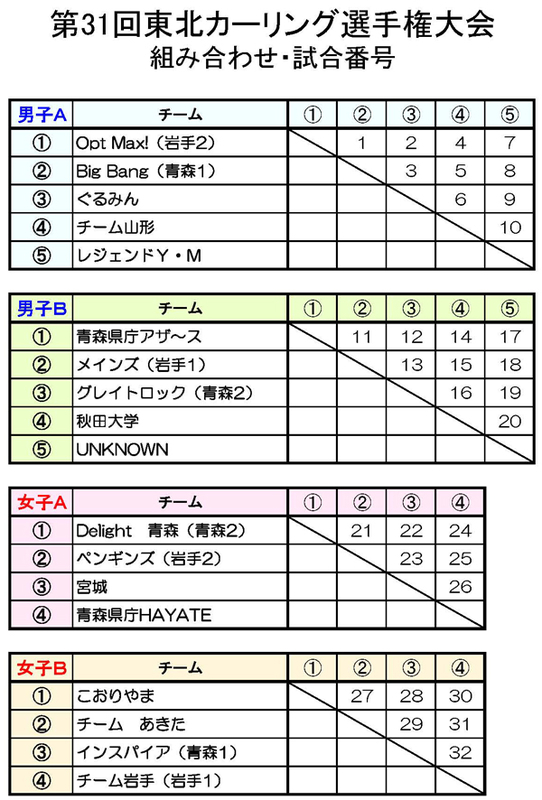 2017-12-20 第31回東北カーリング選手権大会の組合せ 出来事 カーリング 第31回東北カーリング選手権大会の組合せです。 そして、試合日程がこちら。(↓拡大表示可能) 出場チームのみなさん、 日本選手権出場をめざして頑張れ~!! 組合せと試合日程のファイルは、 青森県カーリング協会のHPからどうぞ。